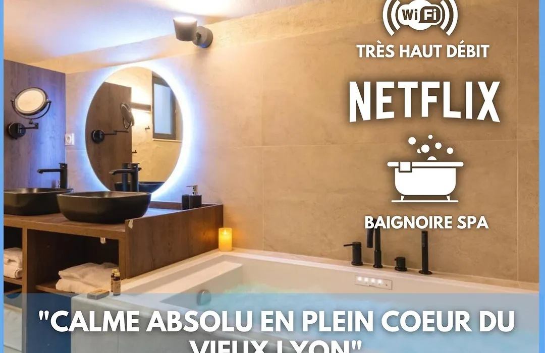 The 50 m² Cocoon Du Vieux Lyon - Luxury Apartment - Balneo apartment includes a patio and is situated about a 5-minute walk from Musee Gadagne. For a truly rejuvenating experience, guests can use a hot tub provided on site.